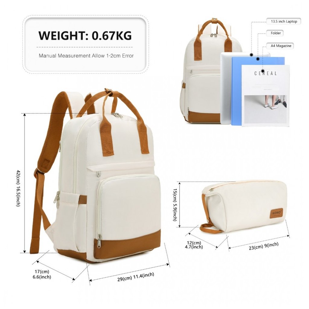Batoh je vyroben z odolného polyesteru a má nastavitelné dlouhé popruhy pro pohodlné nošení během celého dne. Předělený vnitřek pomáhá udržovat věci organizované, zatímco celková hmotnost pouhých 0,7 kg zaručuje lehkost při nošení. Elegantní béžovo-hnědý design zaručuje, že tento set bude vypadat skvěle v jakémkoli prostředí.