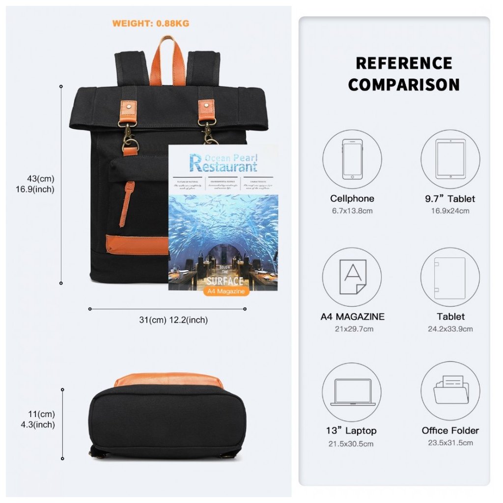 Tento černý plátěný batoh je skvělý společník pro cestování i každodenní použití. S výškou 43 cm, šířkou 31 cm a hloubkou 11 cm má ideální rozměry pro pohodlné nošení. Plátěno jako materiál zajišťuje lehkost, odolnost a stylový vzhled.