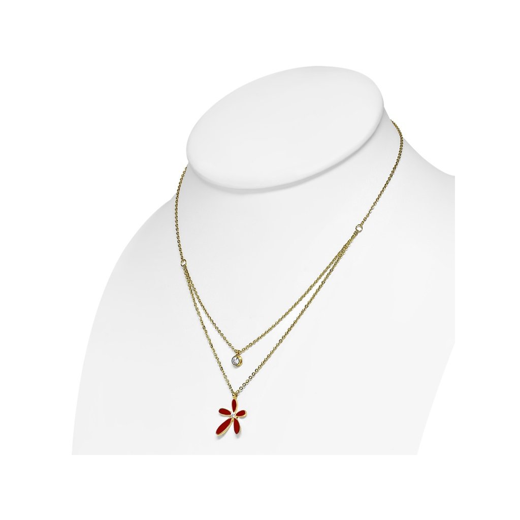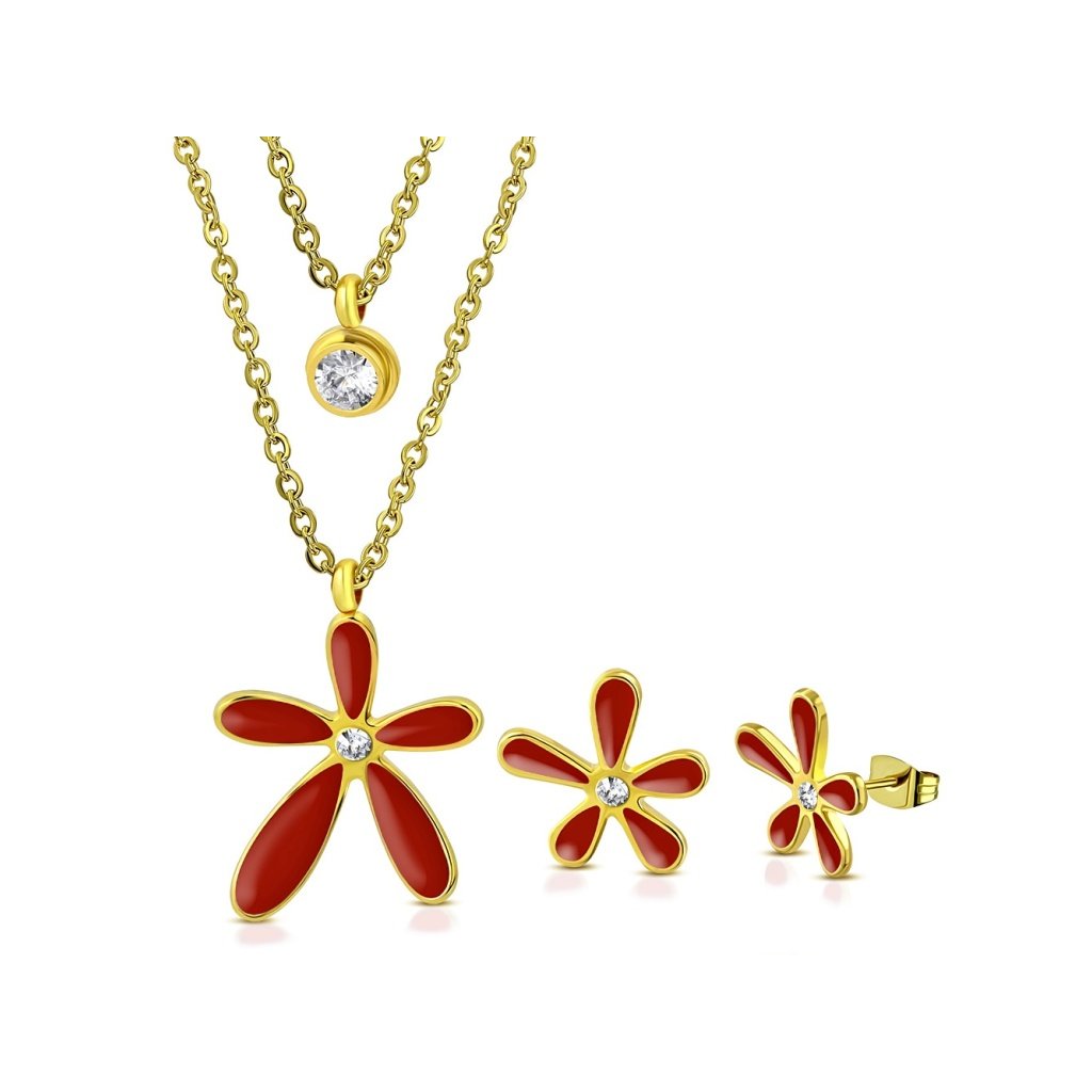 Nádherný dámský set z chirurgické oceli ve zlatém provedení. Přívěsek je ve tvaru květinky v červené barvě , uprostřed kterého je očko čiré barvy. Na řetízku je ještě jedna kratší, na které je maličký přívěsek v podobě čirého očka. Celkově to vytváří dojem dvou řetízků s přívěsky, které jsou spojeny do jednoho. Náušnice mají stejný tvar květinky jako přívěsek a zapínání mají puzetového typu . Tento set je vhodný pro všechny dámy bez rozdílu věku. Materiál řetízku s přívěskem a náušnic je kvalitní chirurgická ocel , která je pevný a odolný materiál, který je antialergický , což bývá velmi rozhodující faktor při výběru šperků .