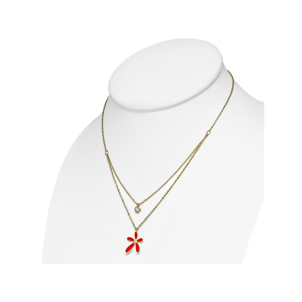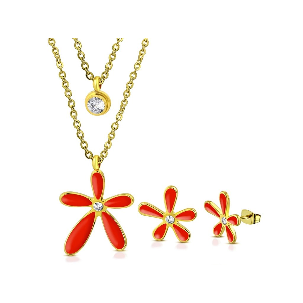 Krásný dámský set z chirurgické oceli ve zlatém provedení. Přívěsek je ve tvaru květinky v pěkné oranžové barvě , uprostřed kterého je očko čiré barvy. Na řetízku je ještě jedna kratší, na které je maličký přívěsek v podobě čirého očka. Celkově to vytváří dojem dvou řetízků s přívěsky, které jsou spojeny do jednoho. Náušnice mají stejný tvar květinky jako přívěsek a zapínání mají puzetového typu . Tento set je vhodný pro všechny dámy bez rozdílu věku. Materiál řetízku s přívěskem a náušnic je kvalitní chirurgická ocel , která je pevný a odolný materiál, který je antialergický , což bývá velmi rozhodující faktor při výběru šperků .