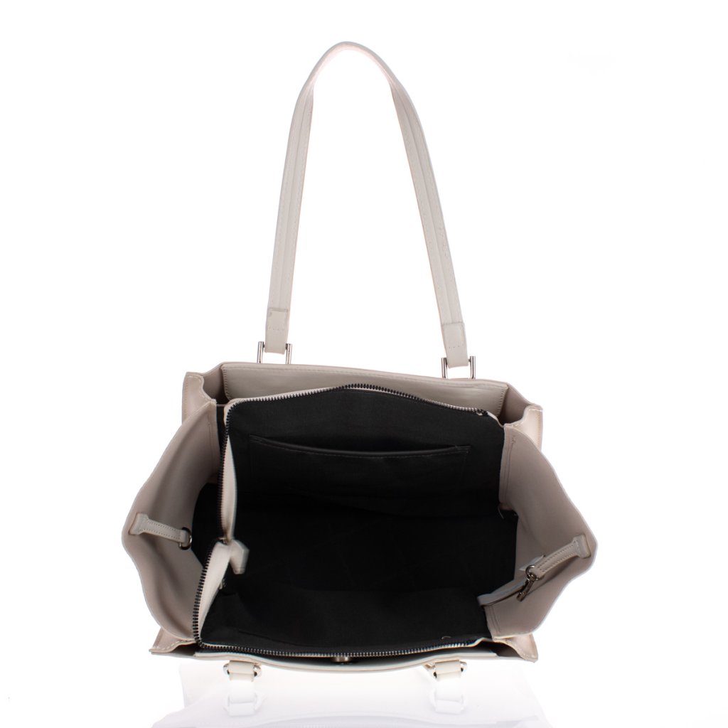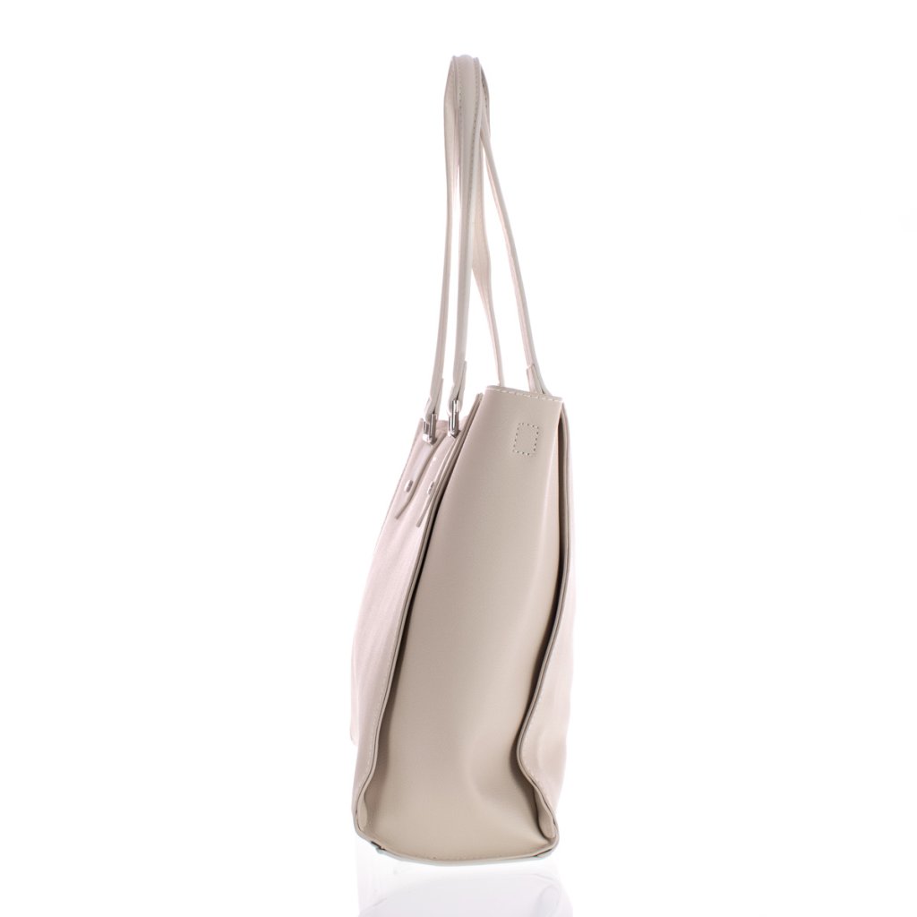 Kabelka je ušita z hladké syntetické kůže v kombinaci se stříbrnými doplňky. Její vnitřek je vhodný na středně velké dámské věcičky, ale vejde se i tablet nebo diář. Pohodlně se nosí dlouhými oušky na rameni. Uzavírá se zipem. Kabelka se dá rozložit, ale i složit pomocí karabinky a tak vznikne nový vnější tvar kabelky.