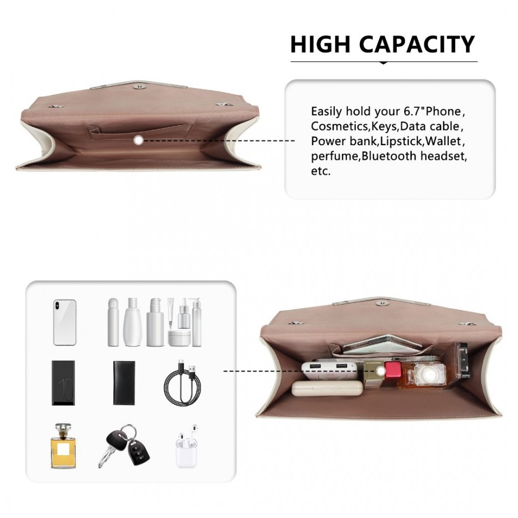 Kabelka je vyrobena z kvalitní látky, která dotváří její jemný vzhled. Její kompaktní rozměry a tvar jsou ideální pro držení v ruce a dodávají vám sofistikovaný vzhled. Cvok zajišťuje bezpečné uzavření, a vnitřní prostor poskytuje dostatek místa pro nezbytné drobnosti.