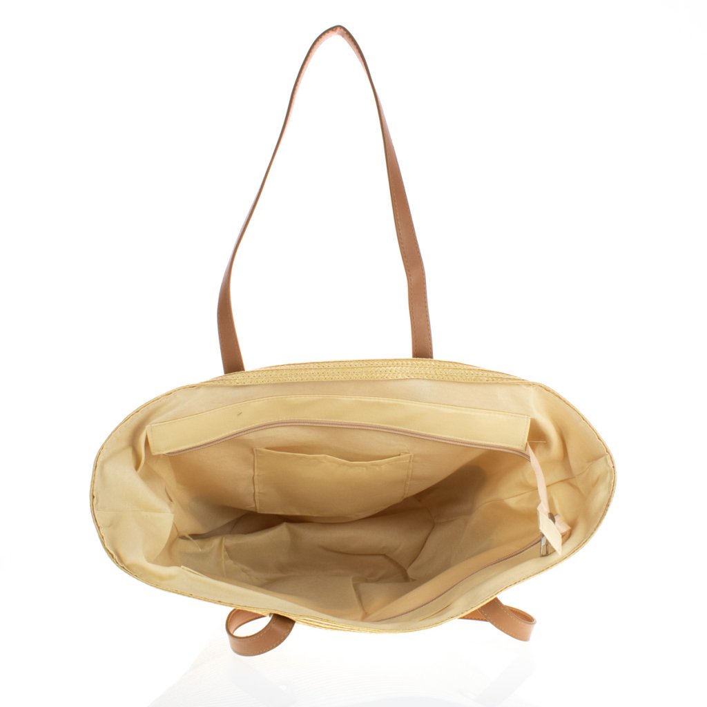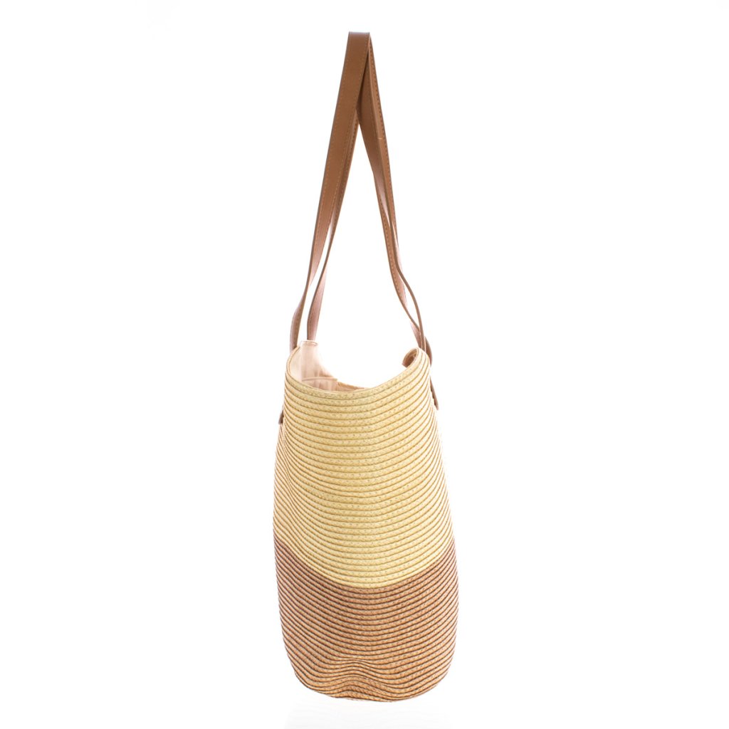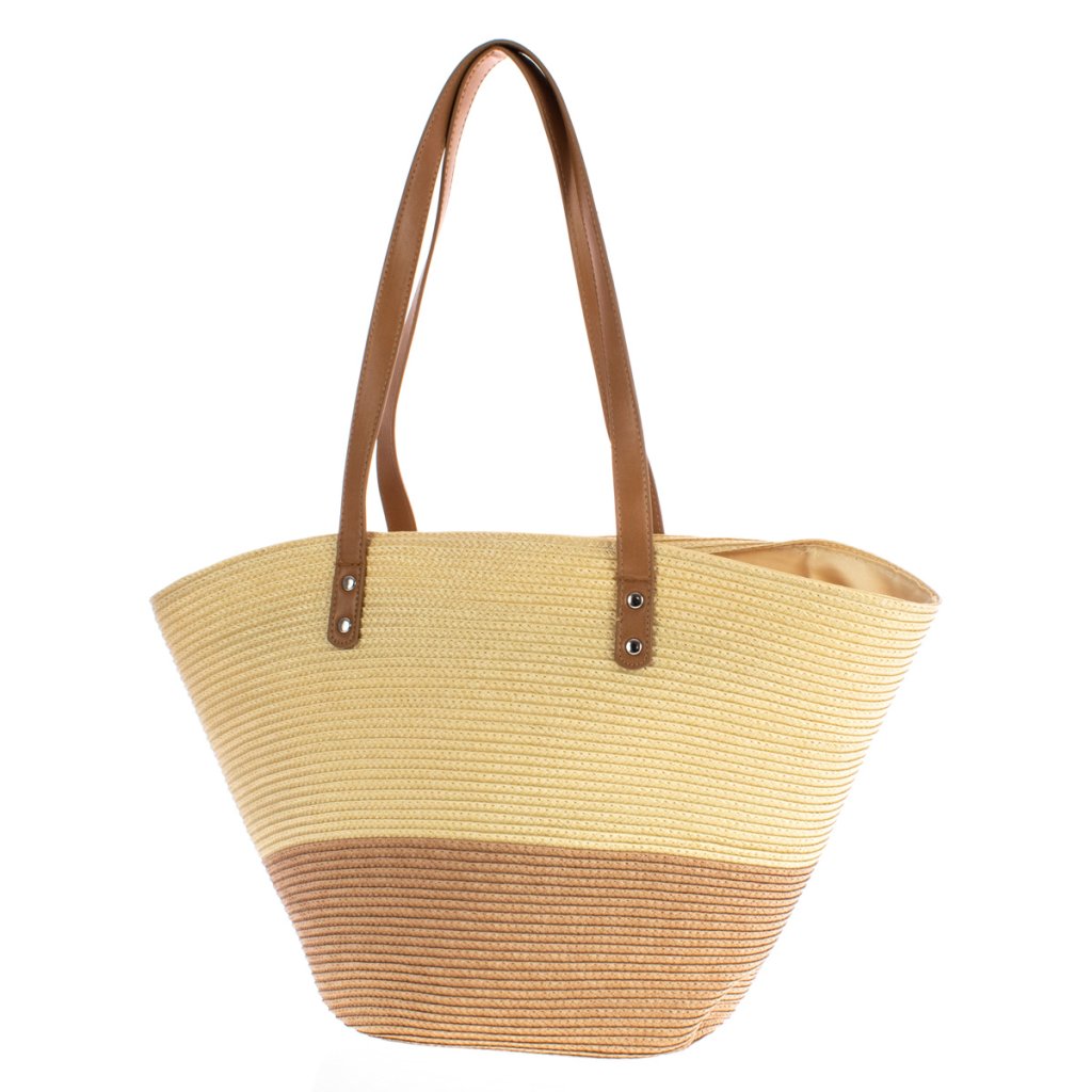 Letní nádech kabelky vytváří zpracování z papírové slámy ve dvoubarevném provedení. Prostorný a velký vnitřek kabelky tvoří textilní podšívka. Kabelka se uzavírá zipem. Je vhodná na plážové doplňky: ručník, opalovací krém, časopis a sluneční brýle a pod. Pohodlně se nosí dlouhými oušky na rameni.