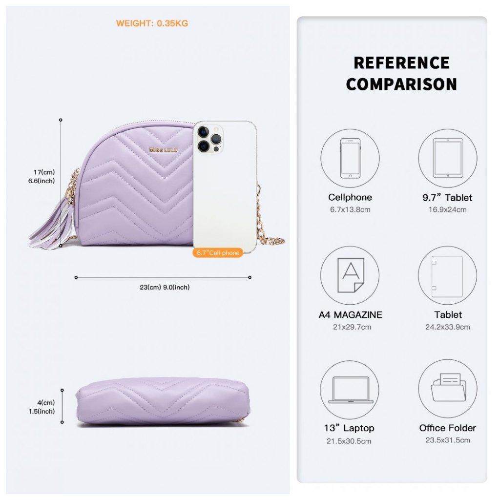 Kabelka je ušita z koženky s prošíváním. Její vnitřek je menší, vhodný na dámské drobnosti. Má dvě hlavní přihrádky se zipovým zapínáním. Kabelka se pohodlně nosí crossbody popruhem. Styl a leganci doplňuje hrozen a zlaté doplňky.
