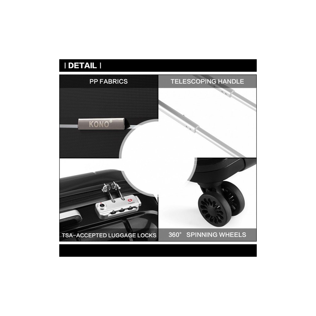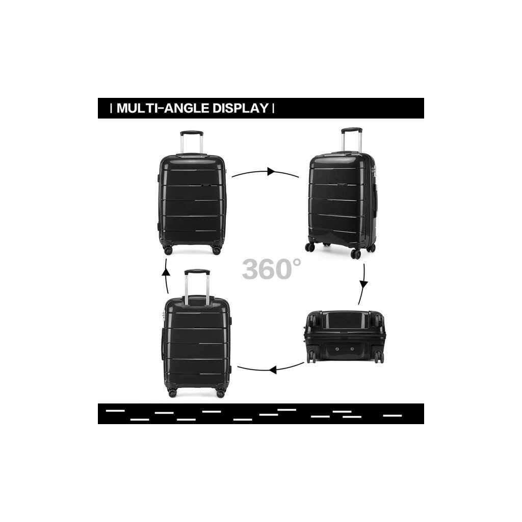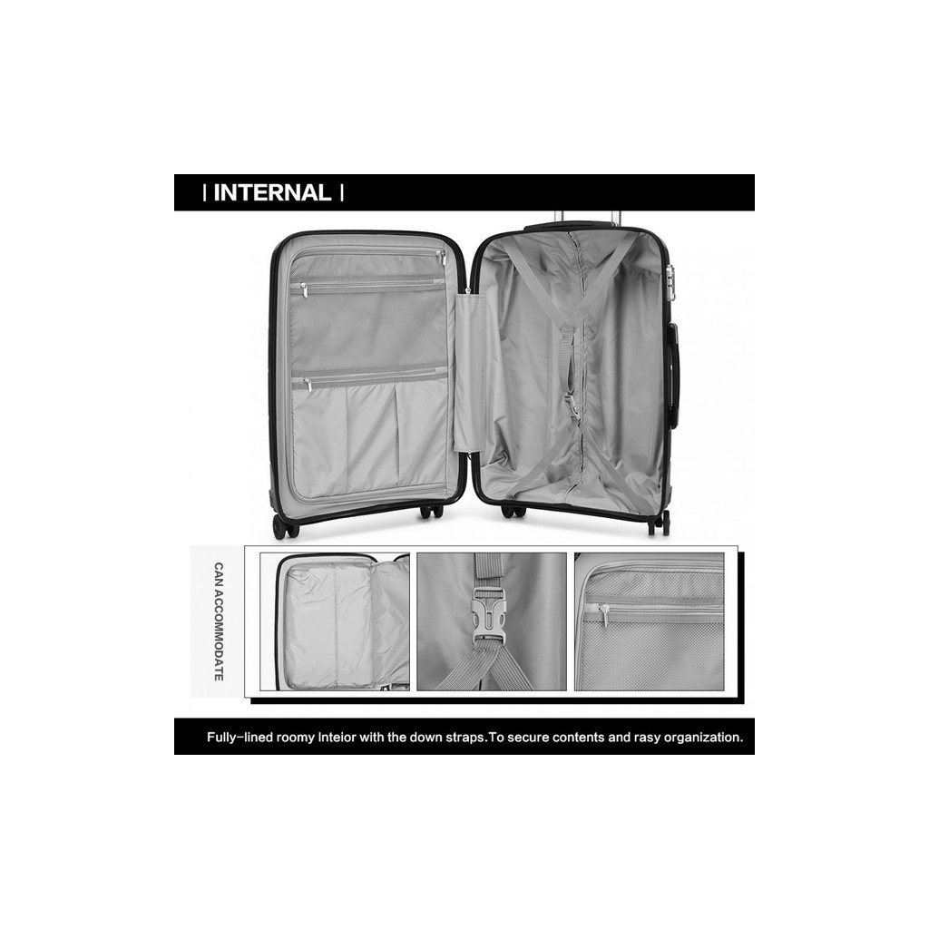 Kufr je vyroben z pevného PP plastového materiálu, který je pevný a odolný vůči nárazům a poškození. S zavazadly se zachází prakticky a snadno díky teleskopické hliníkové rukojeti a 360 - stupňovým kolečkům. Výška s teleskopickou rukojetí je 102 cm u všech kufrech. O bezpečnost vašeho zavazadla se opravdu nemusíte bát, nakolik kufry disponují se speciálním zámkem na kód. Vyztužené vnitřek je dokonale přizpůsobeno pro vaši zavazadla, kterou zajistíte gumovými pásky. Kosmetické drobnosti či jiné technologické věcičky lze vložit do zipových složek.