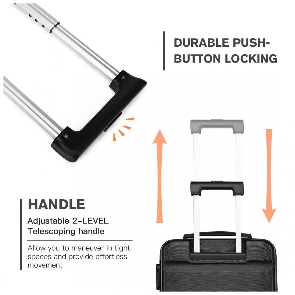 Kufr je vyroben z pevného, lehkého a odolného ABS plastového materiálu s černými plastovými doplňky. Se zavazadly se zachází prakticky a snadno díky teleskopické hliníkové rukojeti a 360 - stupňovým kolečkům. O bezpečnost vašeho zavazadla se opravdu nemusíte bát, protože kufr disponuje speciálním zámkem na kód. Vyztužený vnitřek je dokonale přizpůsoben pro vaše zavazadla, které zajistíte gumovými pásky. Kosmetické drobnosti či jiné technologické věcičky lze vložit do zipové přihrádky.