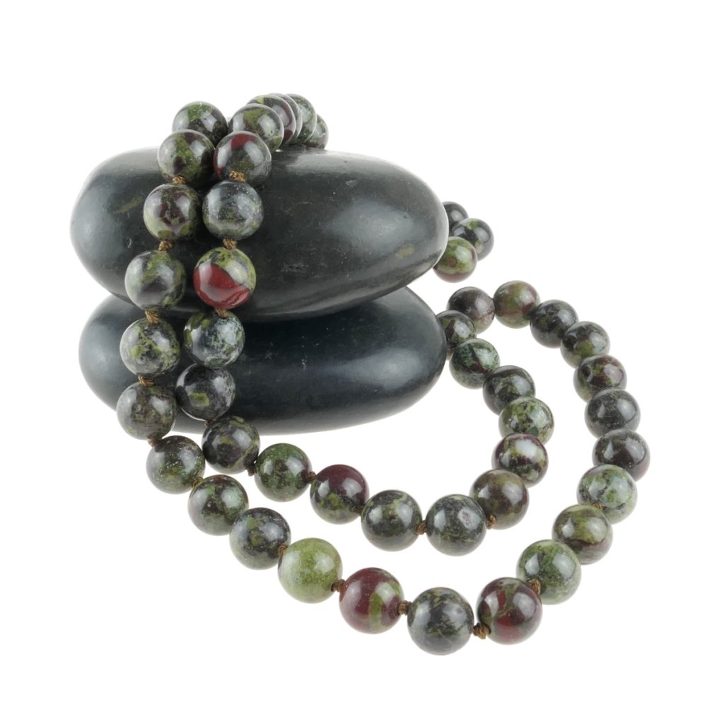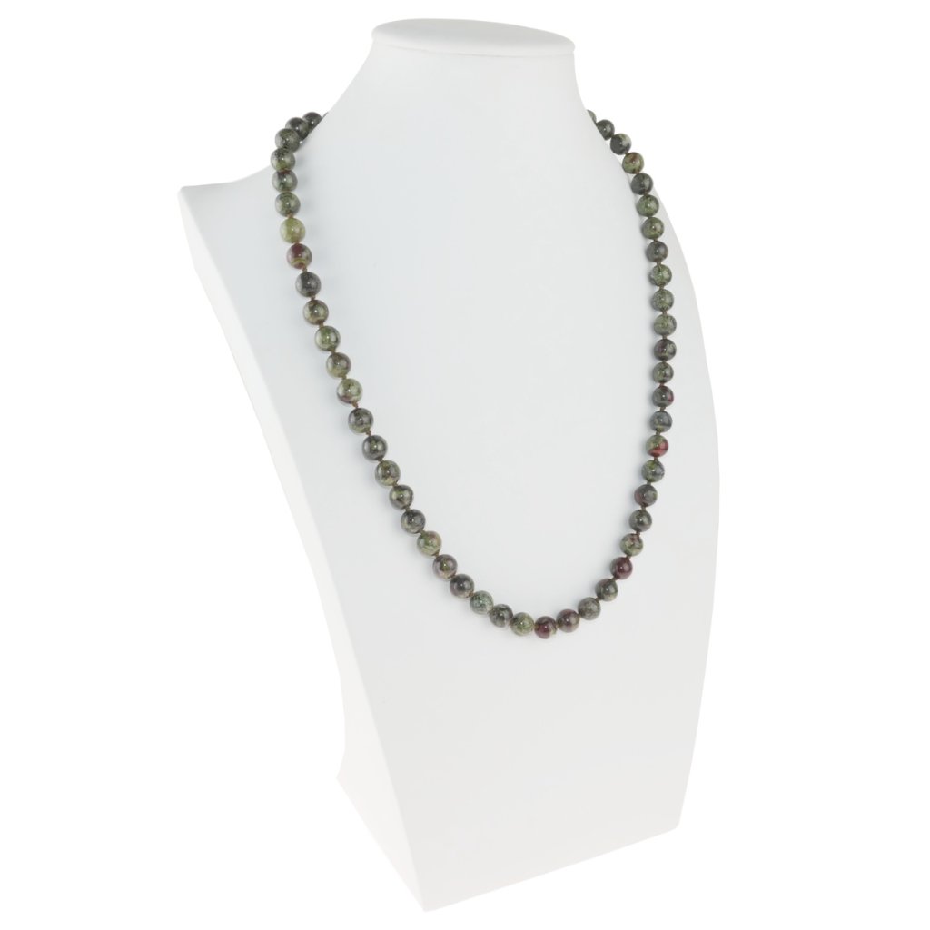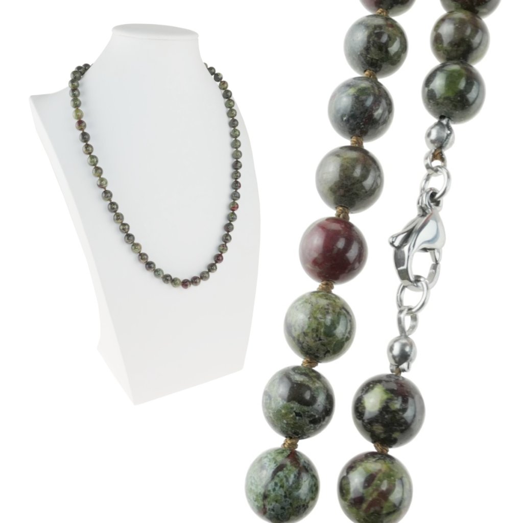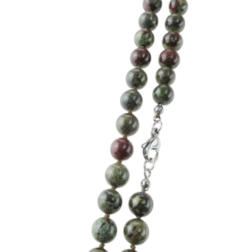 Krásný náhrdelník z polodrahokamu Jaspis Dračí krev , který je vhodný pro pány , ale také dámy . Tento náhrdelník je značky slovenské značky ALEXIS MARTEN . Náhrdelník je ručně pořizován metodou uzlíkování a morálky jsou navlečeny na speciální nite ze 100% přírodního hedvábí, odolné vůči přetržení. Minerál Jaspis Dračí krev známý především jako polodrahokam odvahy . Také má ochranné vlastnosti . Je krásné kombinaci zelených odstínů s tmavě červenou kresbou připomínající france krve. Náhrdelník má bezpečnostní zapínání z kvalitní chirurgické oceli 316 L.