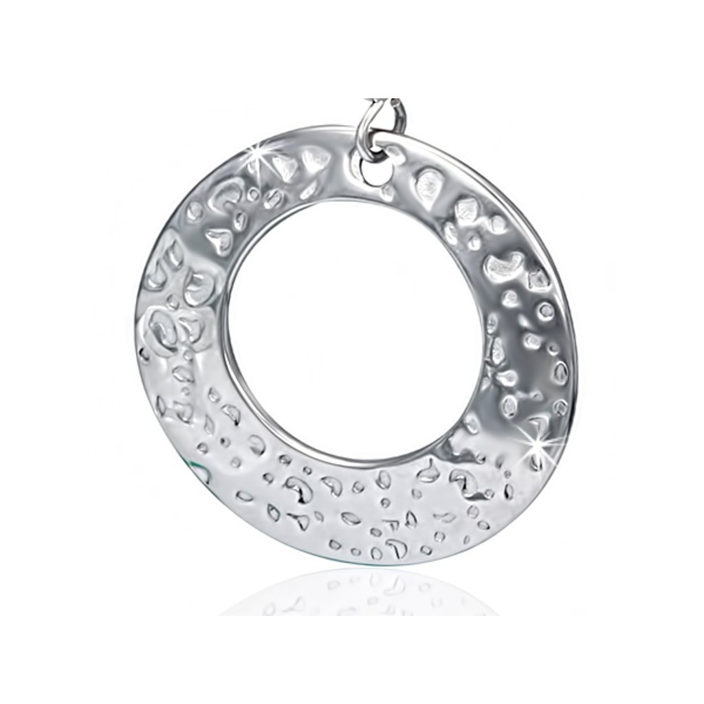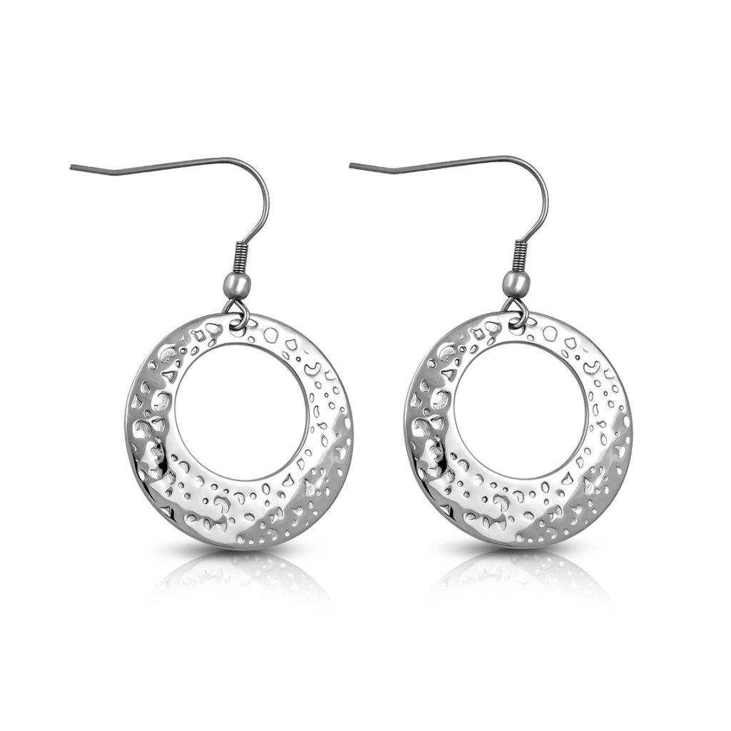 Krásné visící náušnice z oceli ve stříbrném provedení. Náušnice jsou zhotoveny do tvaru pevných kruhů se zajímavou povrchovou úpravou. Náušnice svým antickým vzhledem upoutají už na první pohled. Náušnice jsou vhodné pro všechny věkové kategorie a pro každodenní nošení. Krásně dotvoří ležérní, ale i slavnostní outfit. Díky svému jednoduchému designu se perfektně kombinují také s jinými, klidně i extravagantnějšími, kousky z vaší šperkovnice.