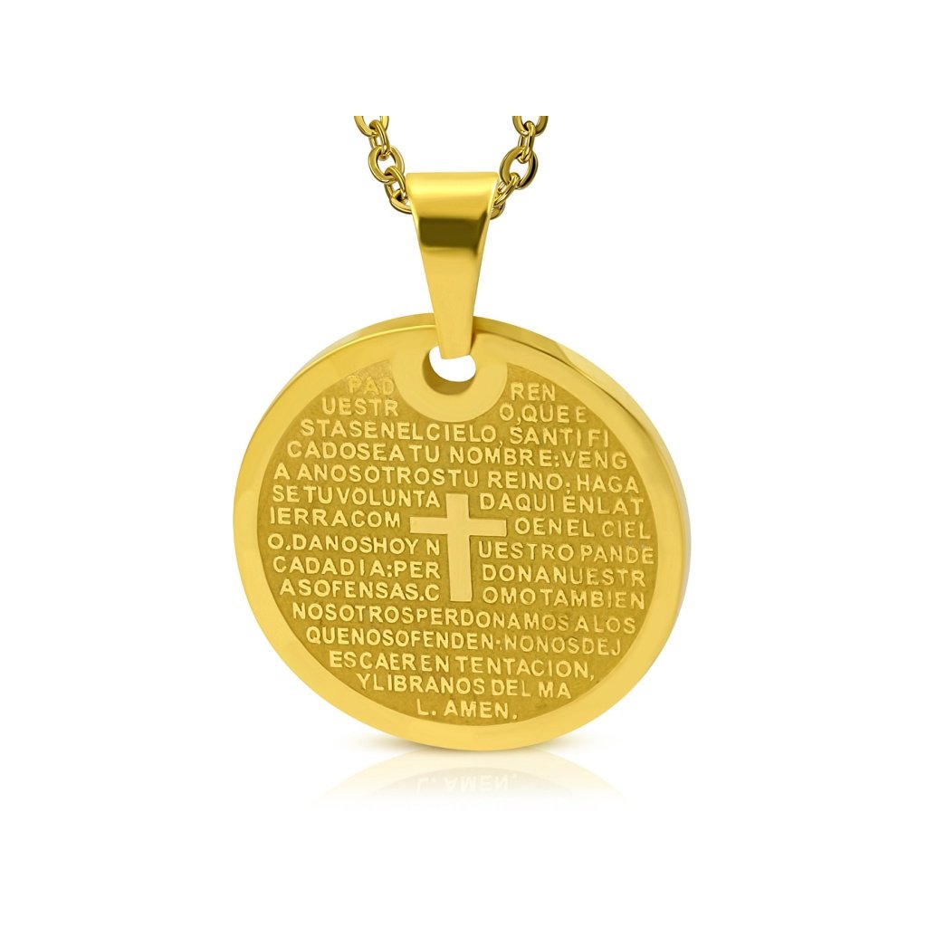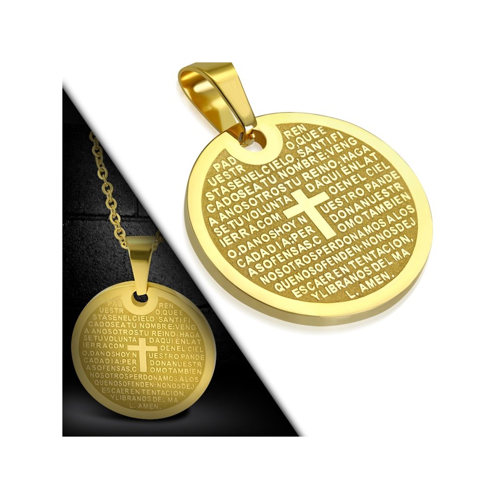 Ocelový řetízek s přívěskem z chirurgické oceli ve zlatém provedení. Přívěsek je kulatý a je na něm vygravírován kříž a modlitba ve španělském jazyce. Šperk působí velmi decentně a jemně, je vhodný pro dámy ale i pro pány. Přívěsek je vhodný jako dárek k památce na církevní událost v životě člověka, nebo jako ochránce pro dospělého. Materiál řetízku a přívěsku je kvalitní chirurgická ocel , která je pevná a odolná. Její výhodou je hypoalergennost, což bývá rozhodující faktor při výběru šperků. U tohoto šperku máte možnost si vybrat vlastní délku řetízku , pokud Vám nevyhovuje jeho základní délka.