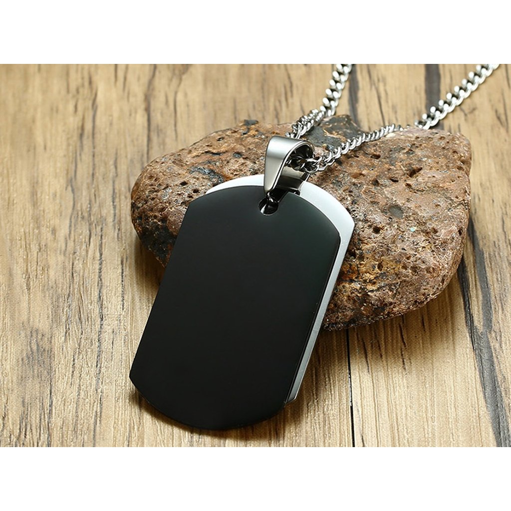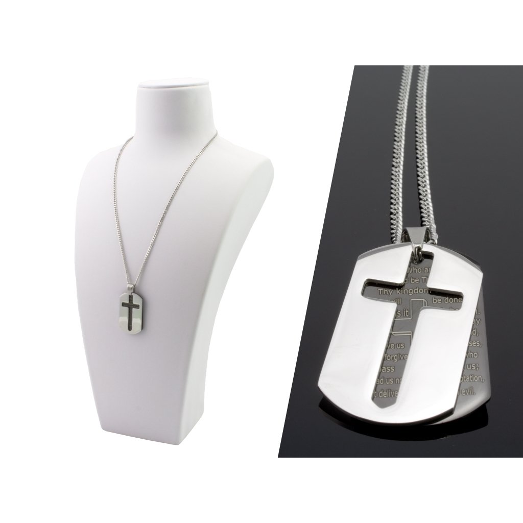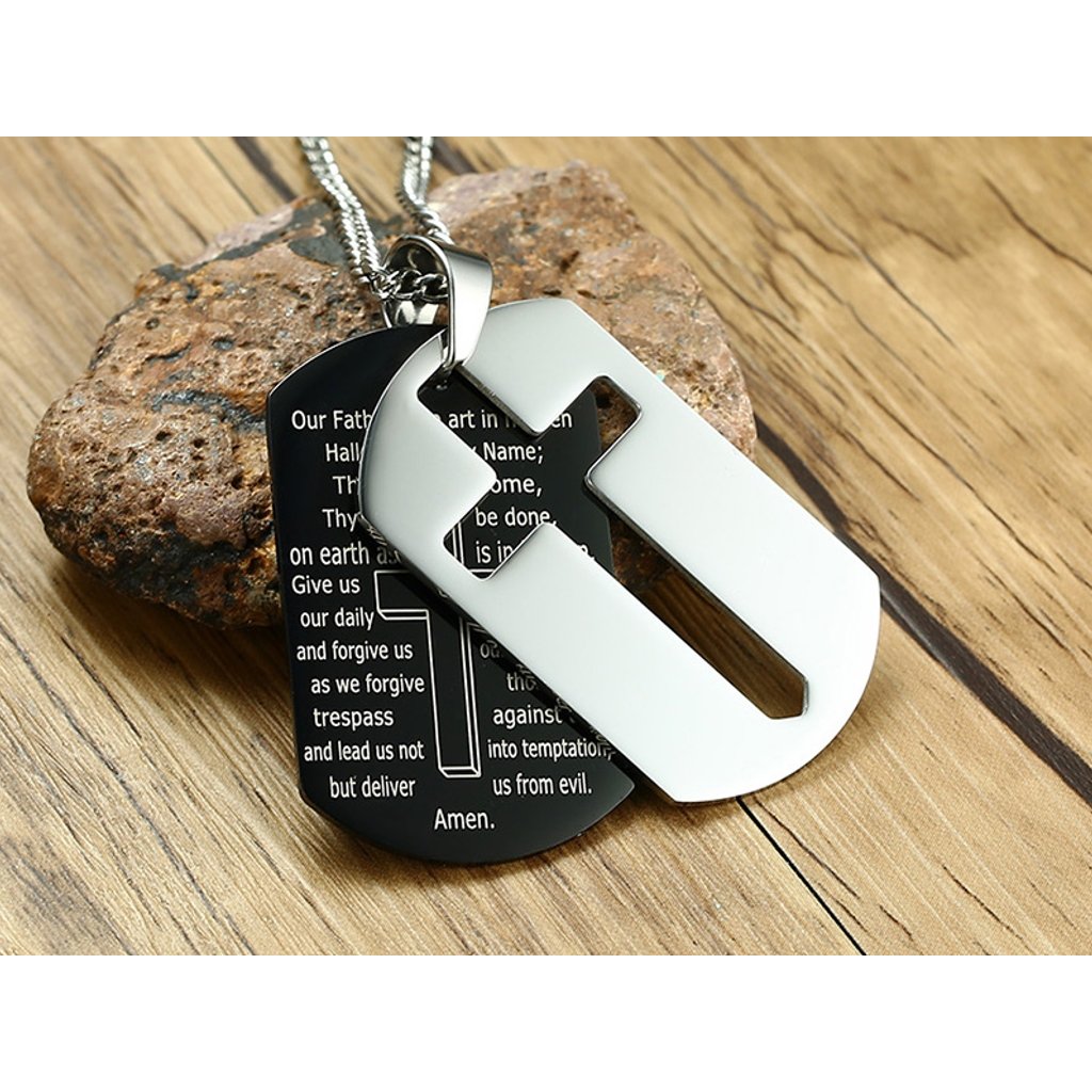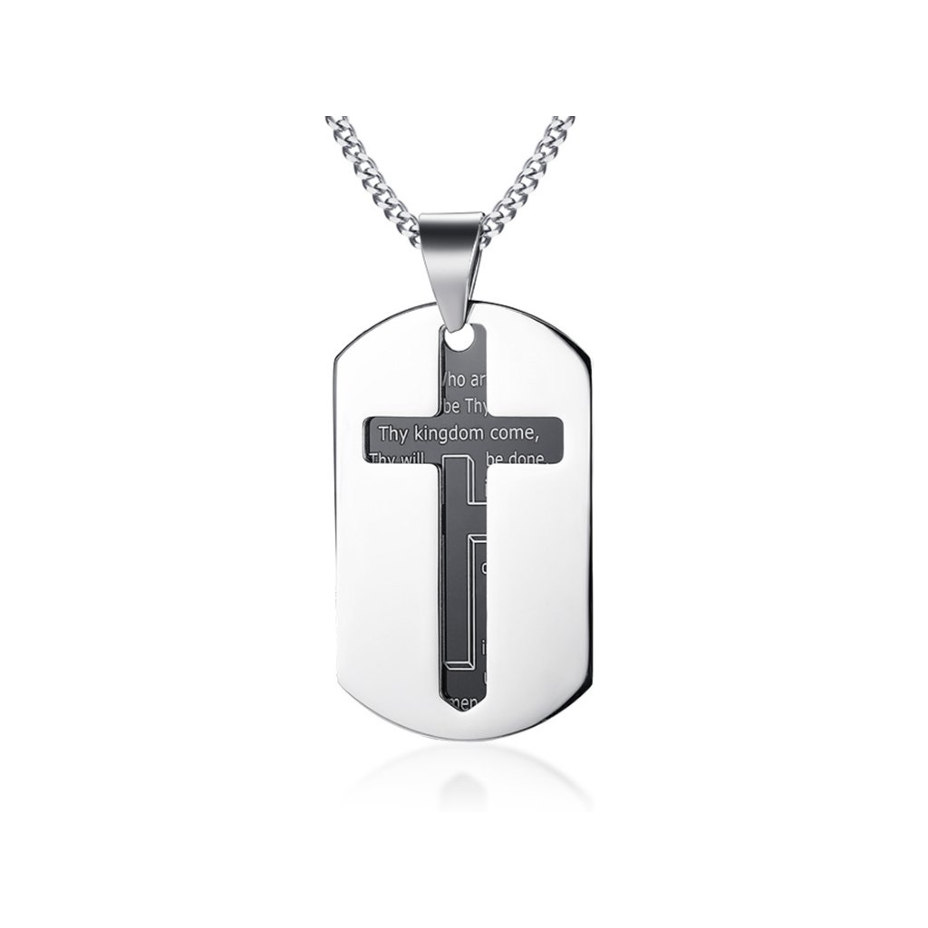 Krásný řetízek s přívěskem 2 plotýnek, kde v první stříbrné plotýnce je vyříznut křížek a ve druhé černé plotýnce je vygravírovaná modlitba v anglickém jazyce. Tento šperk je především určen pro pány. Řetízek s přívěskem je vhodný pro běžné každodenní nošení a pro všechny věkové kategorie. Vhodné i jako dárek například k biřmovce.
