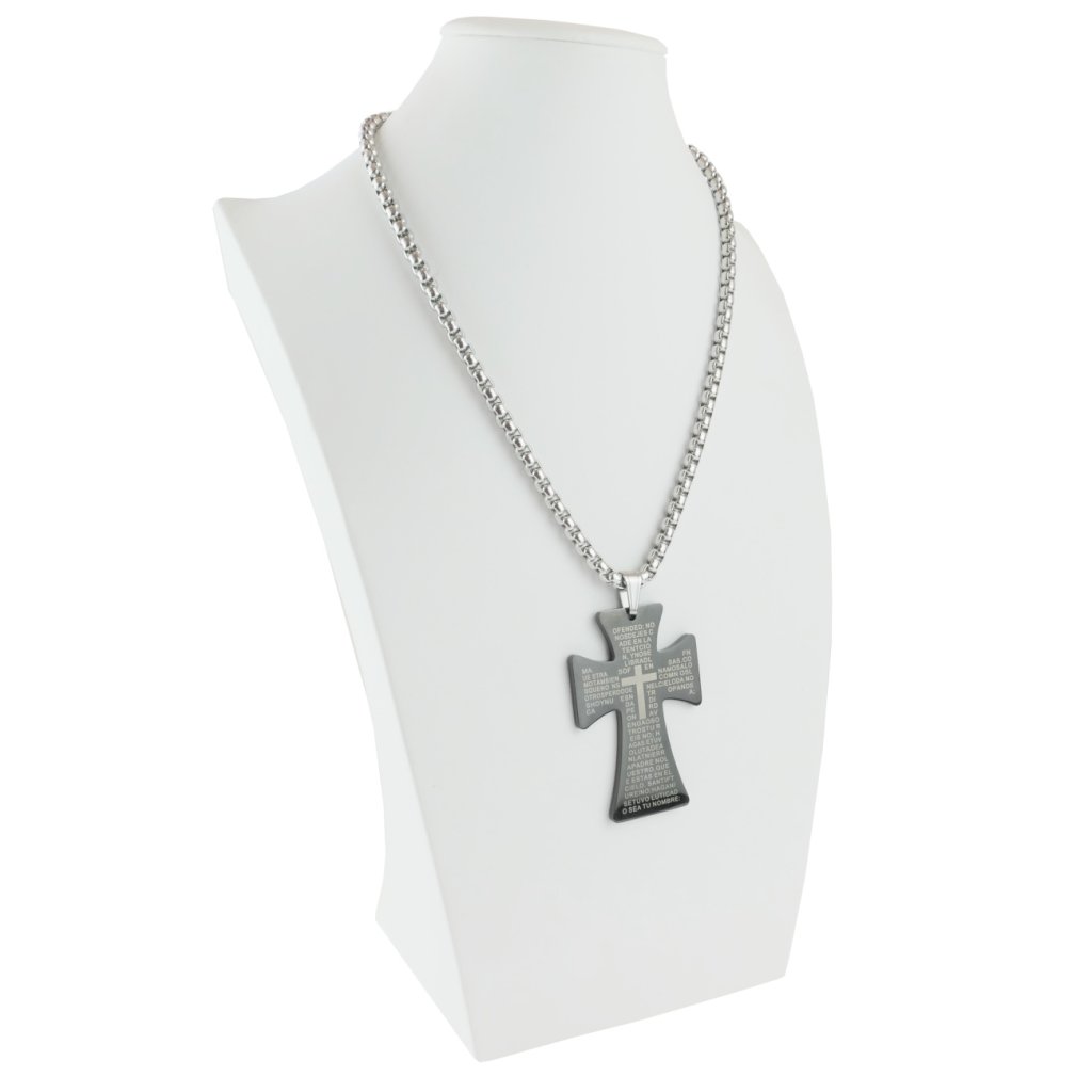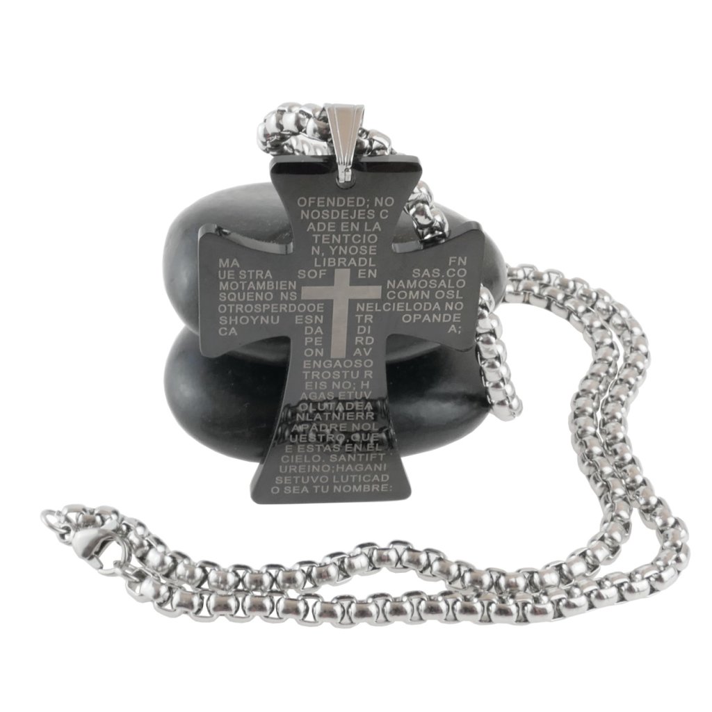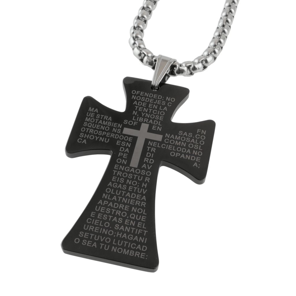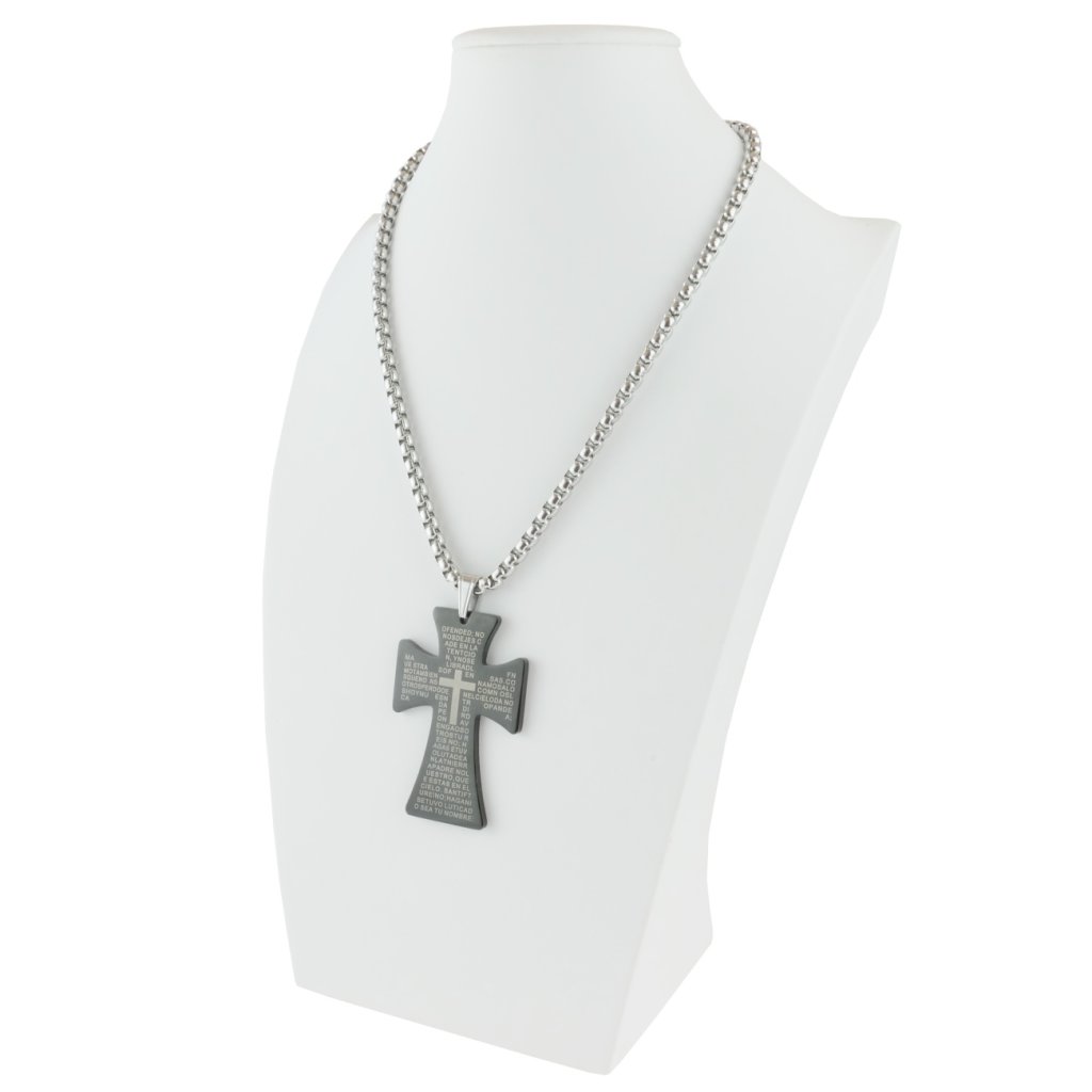 Řetízek s masivním přívěskem kříž v černé barvě s modlitbou Juan