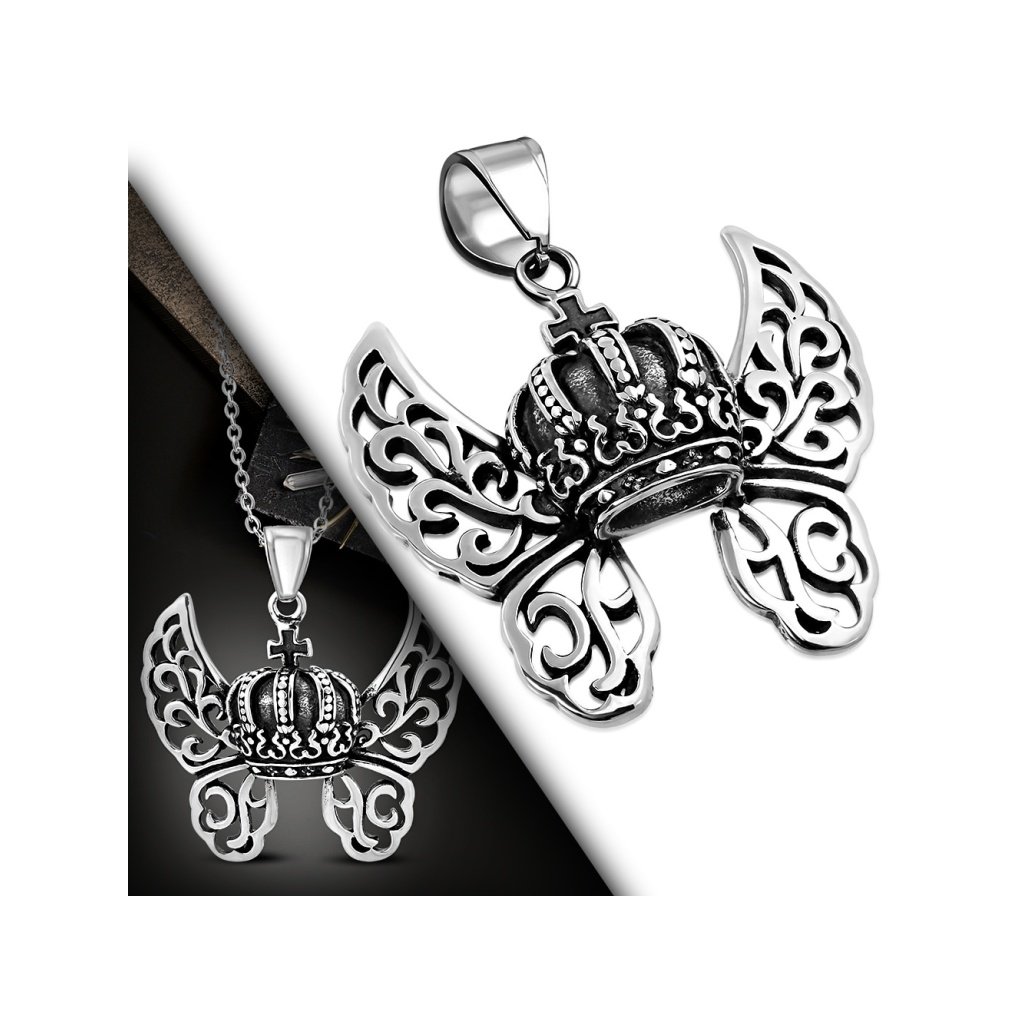 Pánský řetízek s přívěskem z chirurgické oceli ve stříbrné barvě. Přívěsek má tvar královské koruny s křížem na vrchu, ze které po bocích vycházejí pěkně zdobená křídla . Přívěsek je zajímavým šperkem , který jistě zaujme každého. Je zdoben tmavou patinou, díky které působí vintage stylem . Řetízek s přívěskem jsou vyrobeny z chirurgické oceli. Ta má dlouhou životnost, neztrácí svůj lesk, protože narozdíl od jiných materiálů nekoroduje ani nečerná. U tohoto produktu si umíte zvolit Vámi požadovanou délku řetízku , pokud Vám nevyhovuje délka 60 cm.