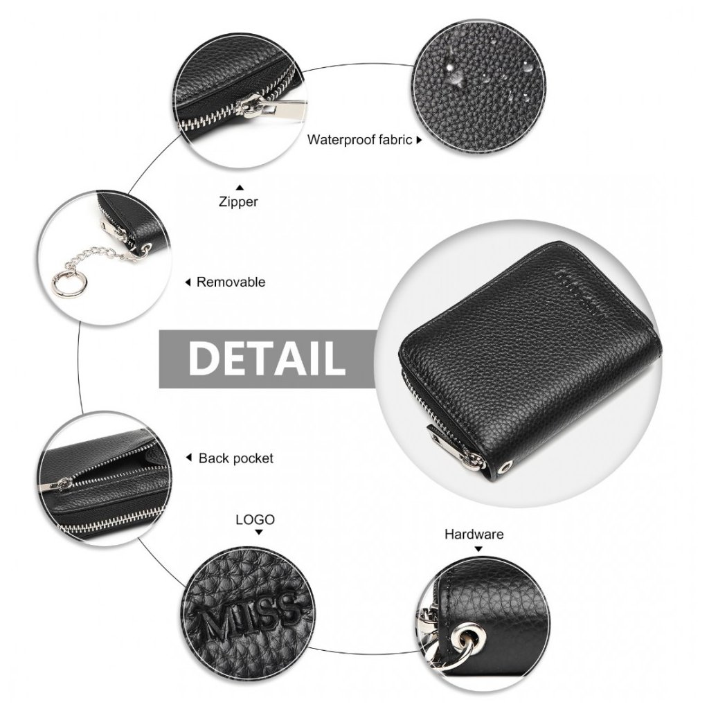 Tato malá černá peněženka na karty je praktickým a stylovým způsobem, jak uchovat své karty. S rozměry 8 cm na výšku, 10 cm na šířku a 2,5 cm na hloubku, je dostatečně kompaktní na to, aby se vešla kamkoli.