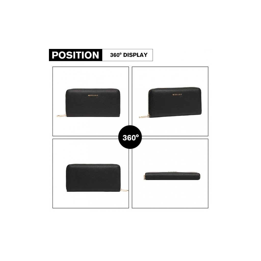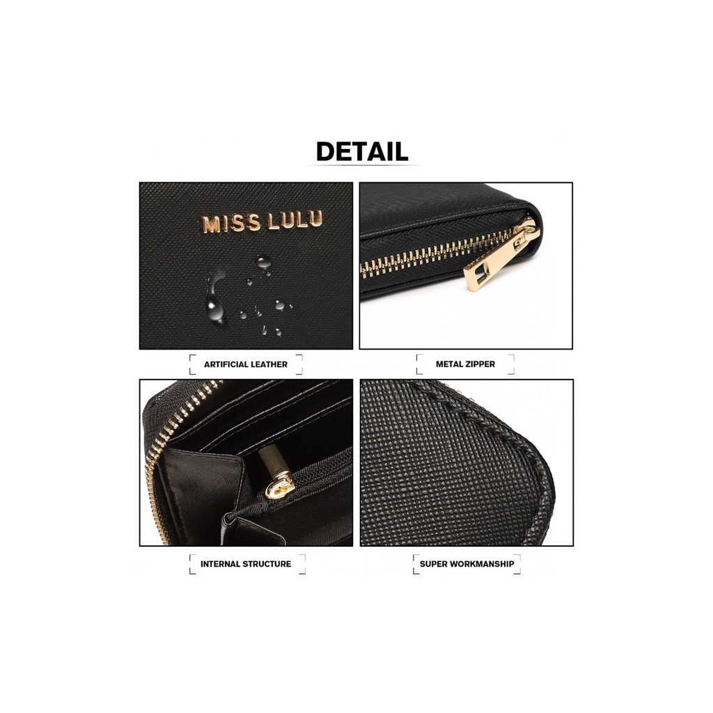 Peněženka je ušita ze syntetické kůže v kombinaci se zlatými doplňky. Uzavírá se zipem. Má přihrádky na karty, bankovky a zipovou přihrádku na mince.