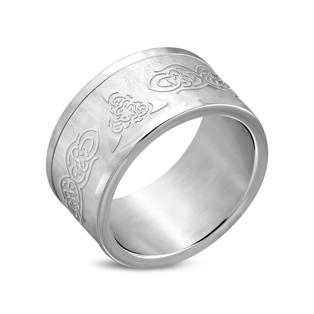 Prsten v tlustším provedení vyrobený z chirurgické oceli. Prsten je stříbrné barvy a zdoben na matném pozadí keltským vzorem po celém svém obvodu. Je vhodnější spíše pro pány, ale nic nebrání ani ženám aby si jím ozvláštnily svůj oufit! Snadno jej doladíte přívěskem nebo náušnicemi . Materiál prstenu je pevná a odolná chirurgická ocel , která nekoroduje ani nečerná, jako například klasická bižuterie. Šperky z chirurgické oceli nevyžadují žádnou speciální péči, a přitom si udržují svou barvu a lesk. Ocelové šperky jsou vhodné pro běžné každodenní nošení, protože jsou antialergické . ŠIROKÝ VÝBĚR VELIKOSTÍ!