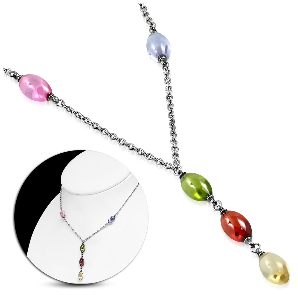 Stylový náhrdelník z chirurgické oceli s přívěskem. Řetízek zdobí čtyři oválné kameny. Rozměry přívěsku jsou 50 x 7 mm a řetízek je dlouhý 47 cm . Průměr řetízku j 1 mm. Zapínání tohoto náhrdelníku je na karabinku. Hmotnost celého náhrdelníku je: 13,7g. Řetízek je vyroben z kvalitní chirurgické oceli
