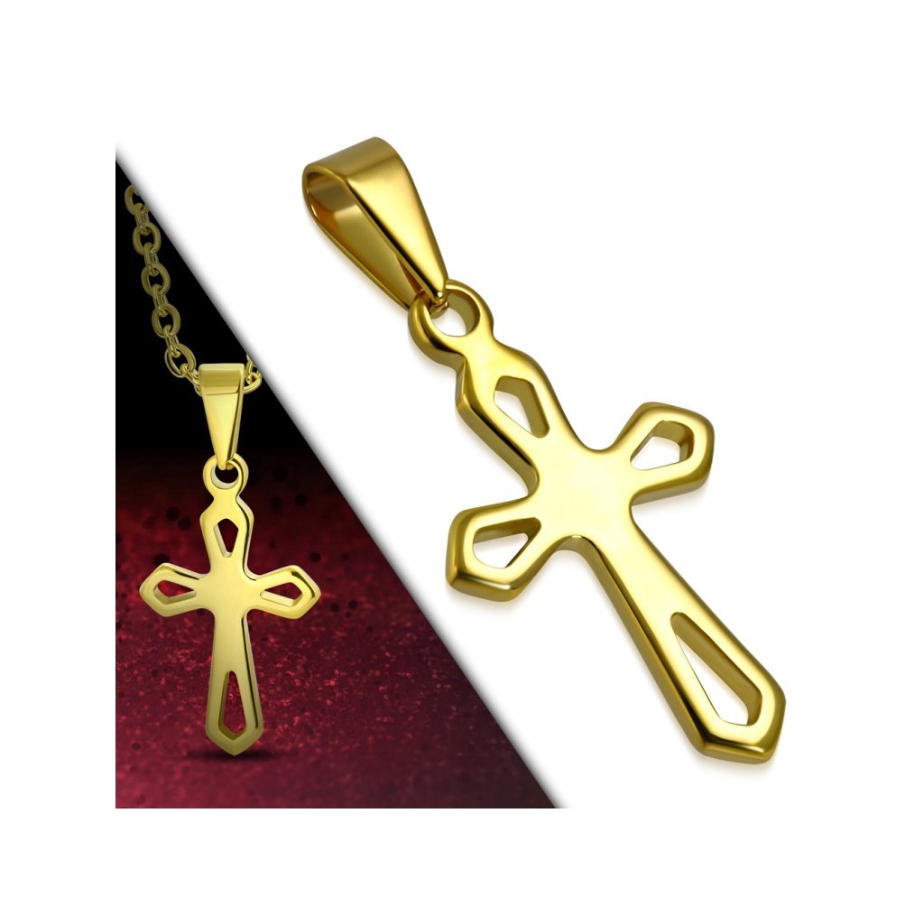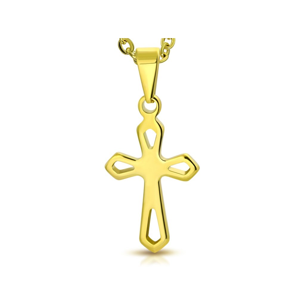 Jemný přívěsek kříž vyrobený z chirurgické oceli ve zlaté barvě. Tvar přívěsku je menší kříž vyříznutými otvory. Šperk působí jemně a decentně a je vhodný pro ženy, ale i muže, kteří preferují minimalistický styl. Náboženský symbol kříž je stále velmi často vyhledávaným motivem šperků , protože je vhodný i jako dárek. Kvalitní chirurgická ocel je materiál celého šperku. Mezi její výhody patří její odolnost a pevnost, nekoroduje ani nečerná a je hypoalergenní , což je velmi důležitý faktor při výběru šperků. U tohoto šperku máte možnost si vybrat vlastní délku řetízku , pokud Vám nevyhovuje jeho základní délka.