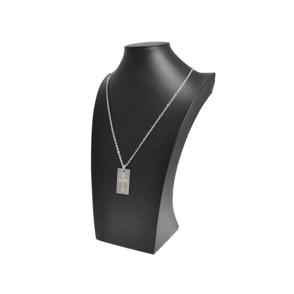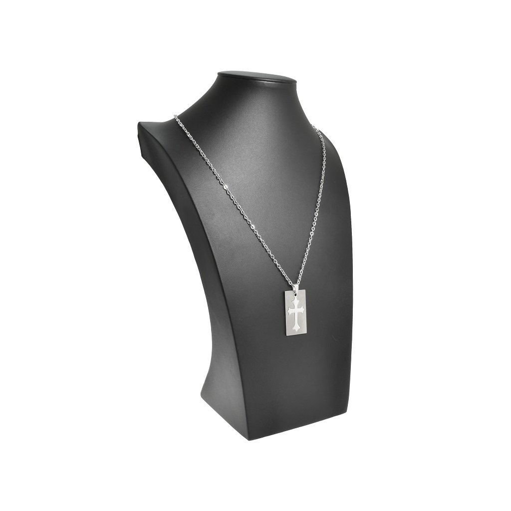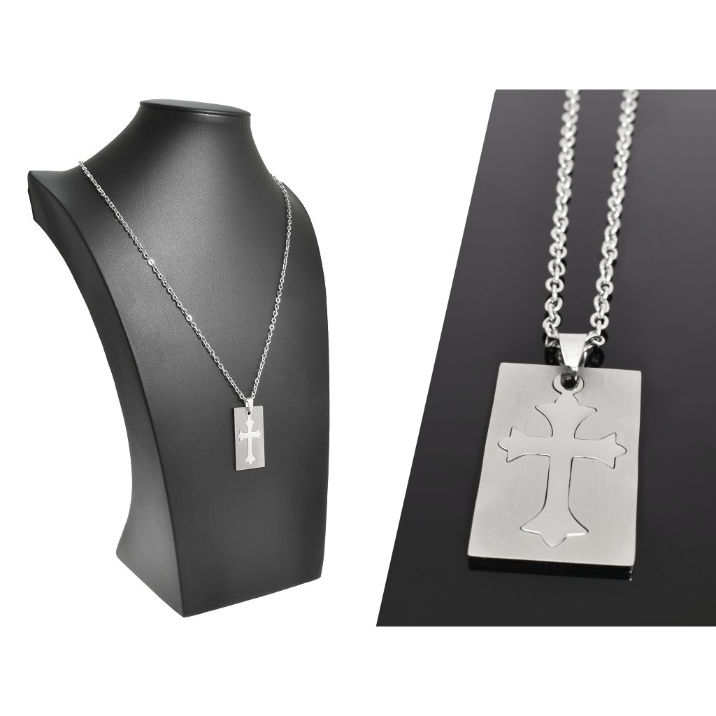 Pánský řetízek s přívěskem ve stříbrné barvě. Přívěsek plotýnka nemá typický zaoblený tvar, ale má tvar hranatého obdélníku, uvnitř kterého je pohyblivý kříž. Přívěsek je poněkud větších rozměrů a je vhodný pro všechny věkové kategorie pánů. Materiál řetízku a přívěsku je kvalitní chirurgická ocel, která nekoroduje, nečerná a má dlouhou životnost, přestože nevyžaduje speciální péči. Ocel je pevný a odolný materiál, který je vhodný pro běžné každodenní nošení, protože je hypoalergenní. U tohoto produktu máte možnost si zvolit délku řetízku dle vlastní potřeby.