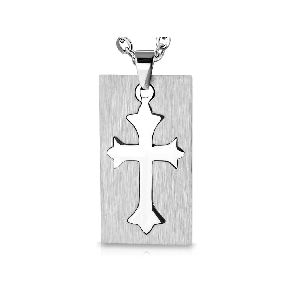 Pánský řetízek s přívěskem plotýnka s křížem z oceli ve stříbrné barvě
