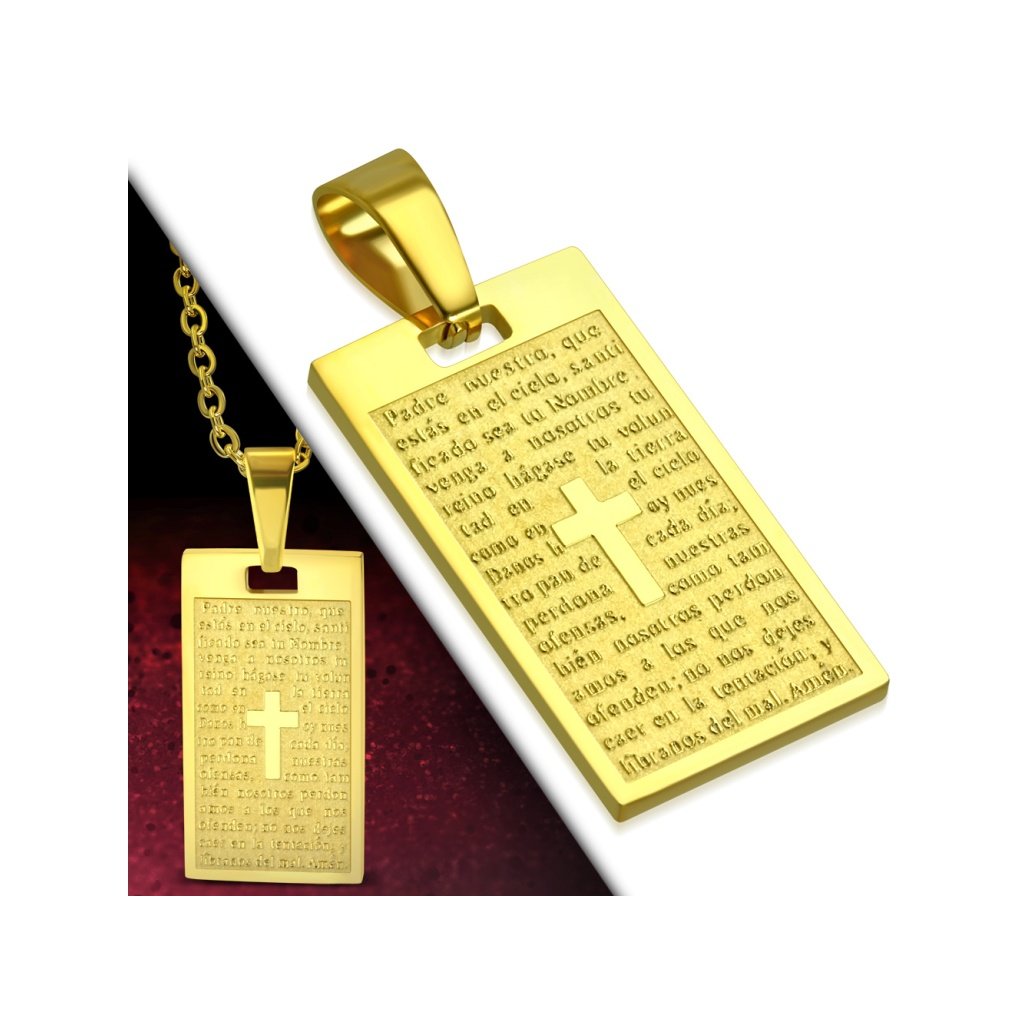 Krásný řetízek s přívěskem plotýnka s motivem z chirurgické oceli ve zlatém provedení. Přívěsek má tvar plotýnky, na které je vygravírován kříž a modlitba ve španělském jazyce. Šperk působí velmi decentně a jemně, je vhodný pro dámy ale i pro pány. Přívěsek je vhodný jako dárek k památce na církevní událost v životě člověka, nebo jako ochránce pro dospělého. Materiál řetízku a přívěsku je kvalitní chirurgická ocel , která je pevná a odolná. Její výhodou je hypoalergennost, což bývá rozhodující faktor při výběru šperků. U tohoto produktu máte možnost si zvolit délku řetízku dle vlastní potřeby.