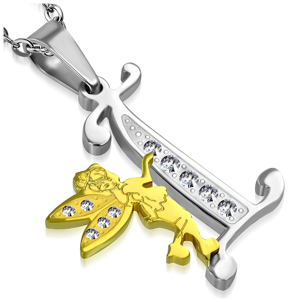 Řetízek z chirurgické oceli s přívěskem ve tvaru písmene "I" 2,3 cm s vílou ve zlaté barvě