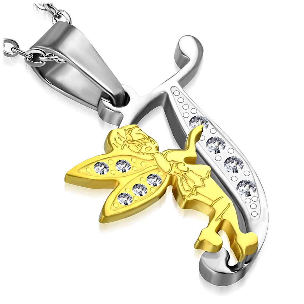 Řetízek z chirurgické oceli s přívěskem ve tvaru písmene "T" 2 cm s vílou ve zlaté barvě