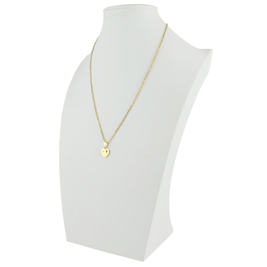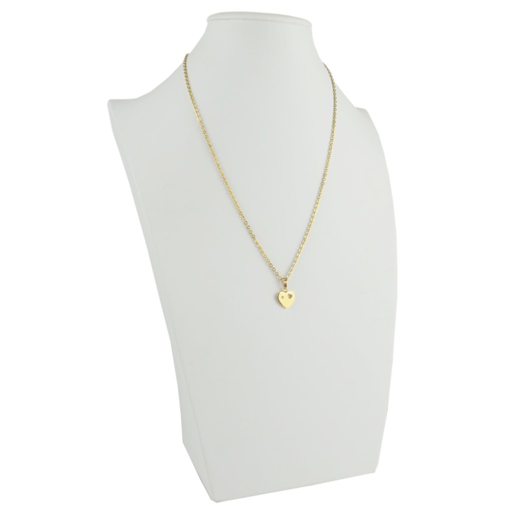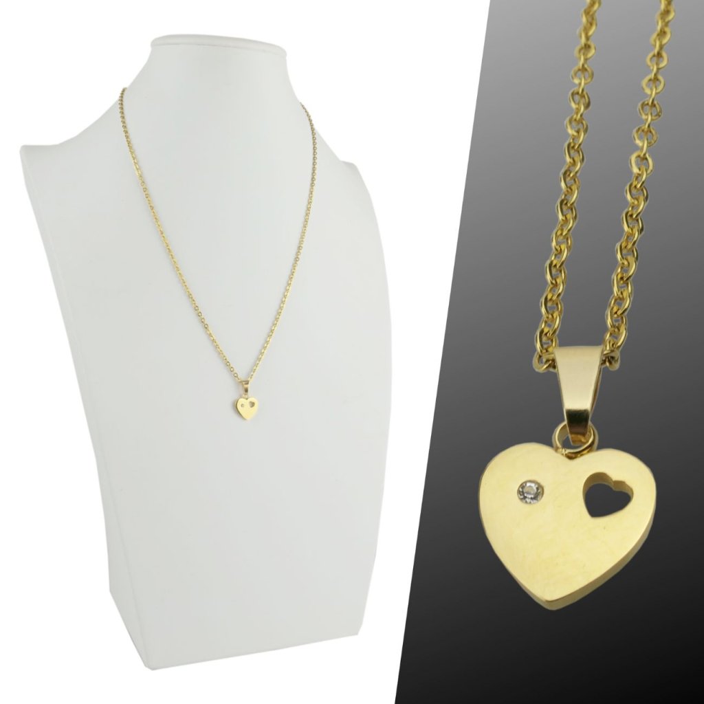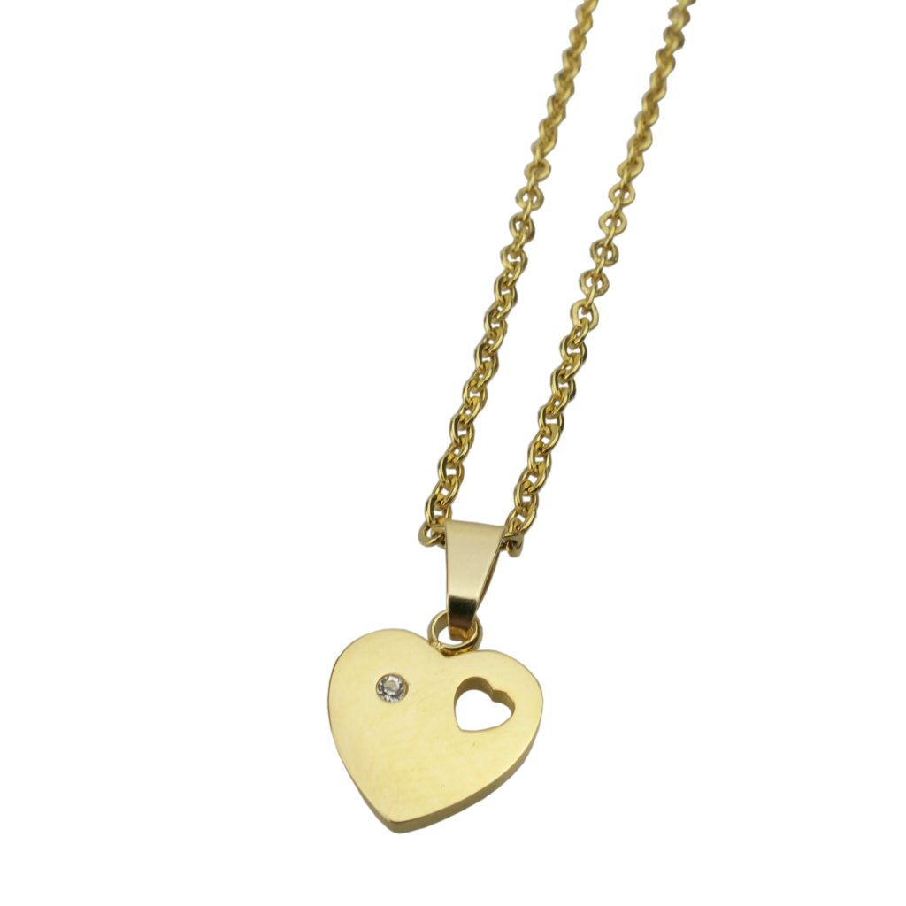 Nádherný a romantický řetízek s přívěskem srdíčko ve zlatém provedení z chirurgické oceli. Přívěsek srdíčko je zdobeno malým vyříznutým srdíčkem a malým očkem v čiré barvě. Řetízek a také přívěsek je vyroben z chirurgické oceli. Chirurgická ocel je materiál, který nekoroduje a je hypoalergenní. Šperk je vhodný pro všechny věkové skupiny.